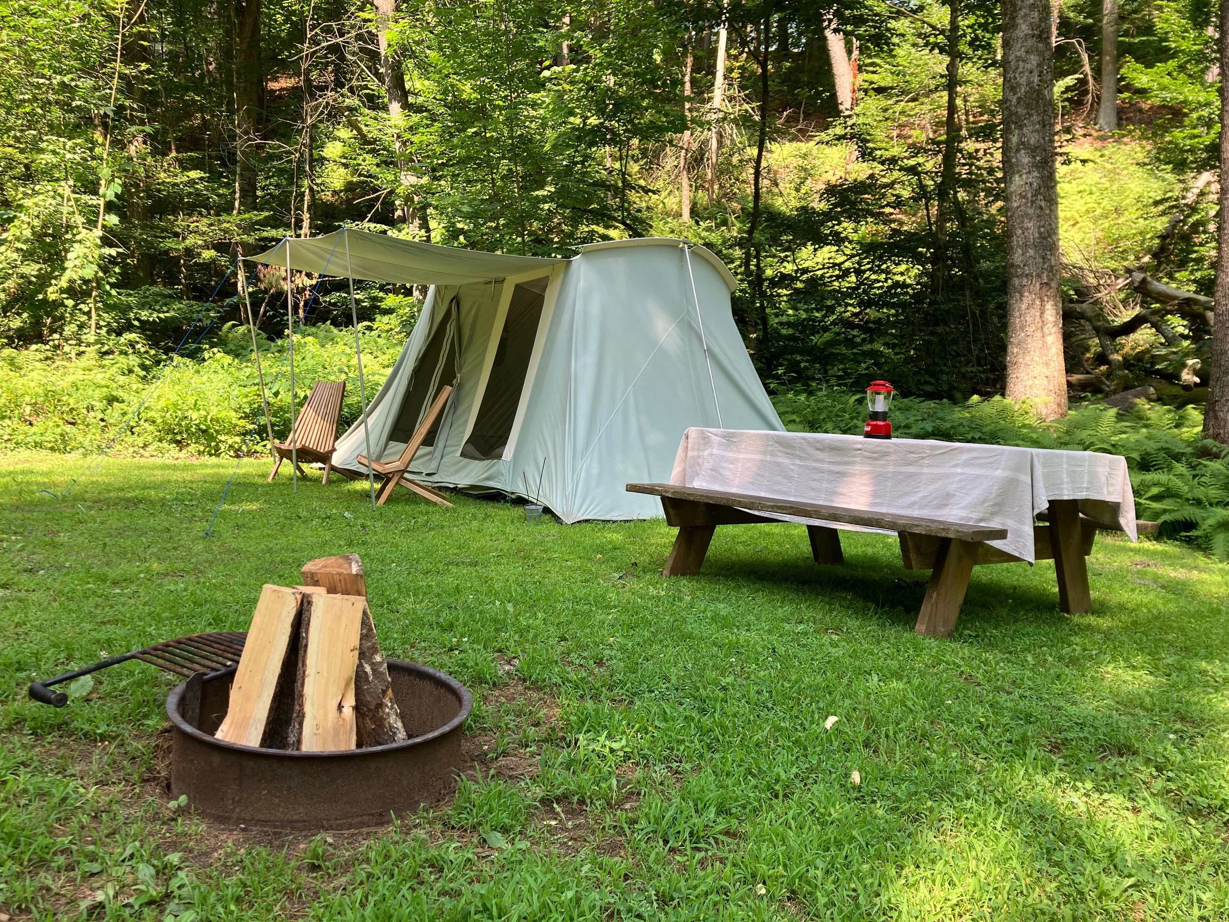 There is a fire pit with a grate for cooking, coleman lantern, a table inside the tent, two chairs for sitting outside the tent and picnic table.